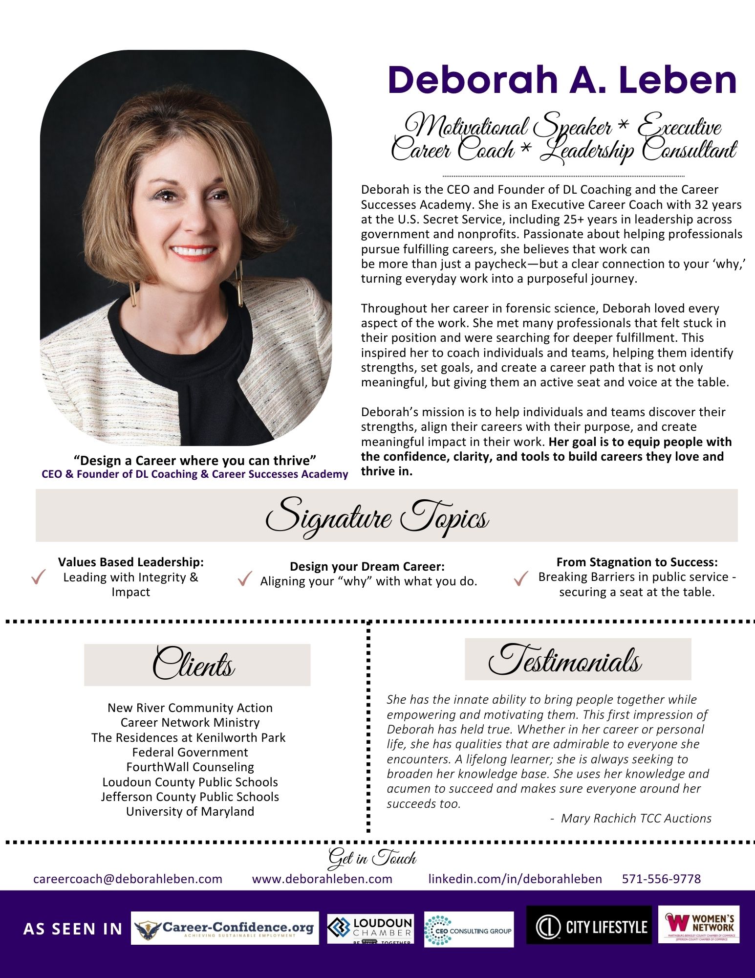 Today, as CEO and Founder of DL Coaching & Career Successes Academy, Deborah’s mission is to equip people with the confidence, clarity, and tools to build careers they love and thrive in. She offers customized solutions to accelerate personal and financial growth through her 5 step strategic framework. Deborah is an Associate Certified Coach through the International Coaching Federation and Certified Personal and Executive Coach through the Coaching and Positive Psychology Institute. Deborah is Adjunct Faculty at George Mason University and Shepherd University.